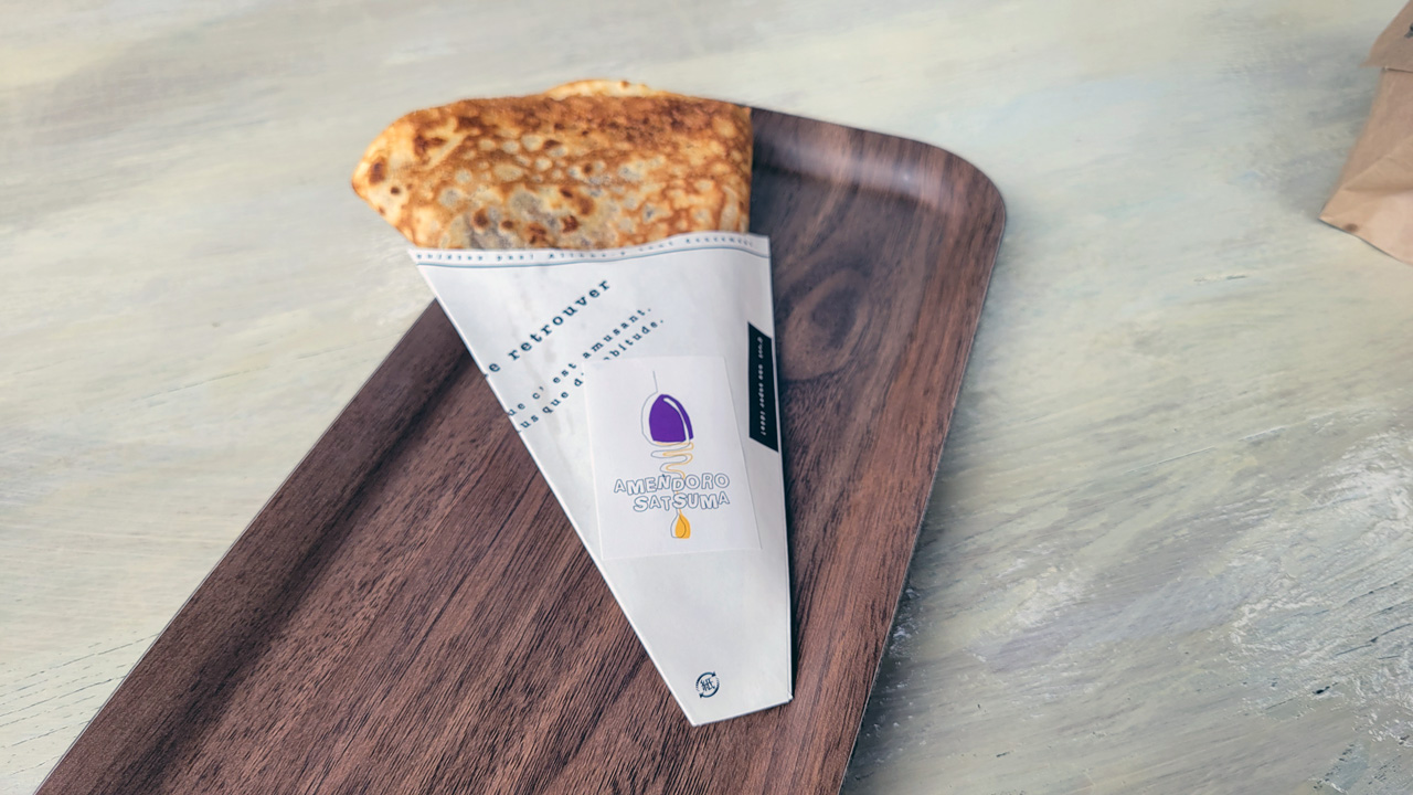 クレープはカリカリもっちり食感のクレープで、あえて具材やクリームを入れずに、あめんどろ本来の甘みと香りを楽しんで頂けるものになっていると思います。