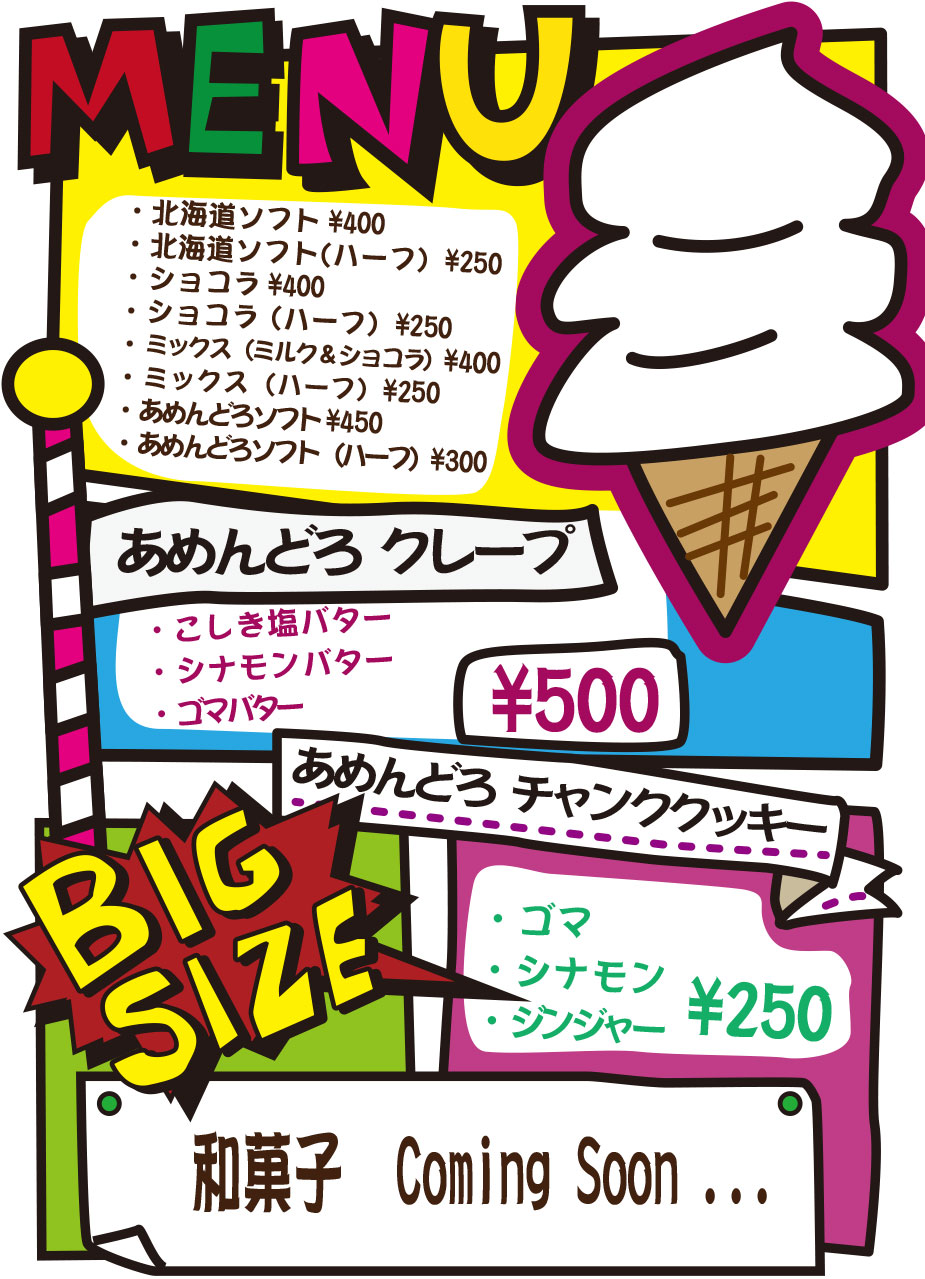 あめんどろを使った、あめんどろソフトクリームは遊湯館の人気商品でしたが、今回、パティシエール前屋彩さんプロデュースのクレープとクッキーが仲間入りしました。