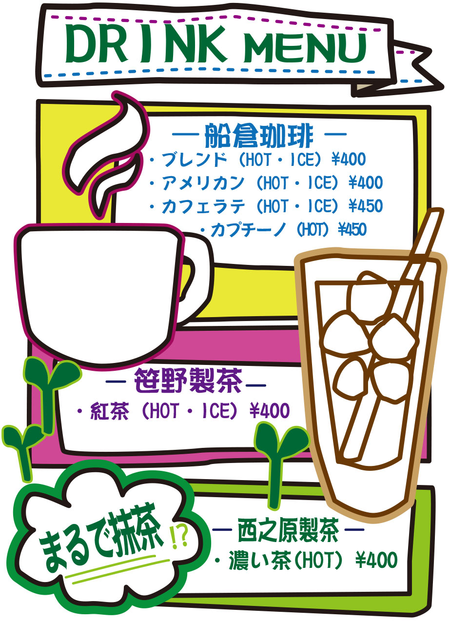 珈琲倶楽部 船倉さんのコーヒー、笹野製茶さんの紅茶、西之原製茶さんの濃い茶をご堪能下さい。
